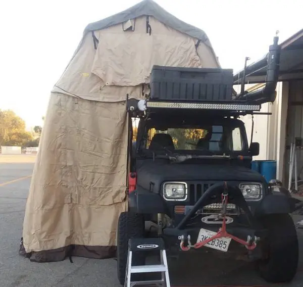 It has a rooftop camper. They are becoming very popular nowadays. This one looks more homemade than others, though it just may be a bit aged. They can be a great buy for you to stay away from the elements if you aren’t ready to upgrade to a glamping lifestyle.